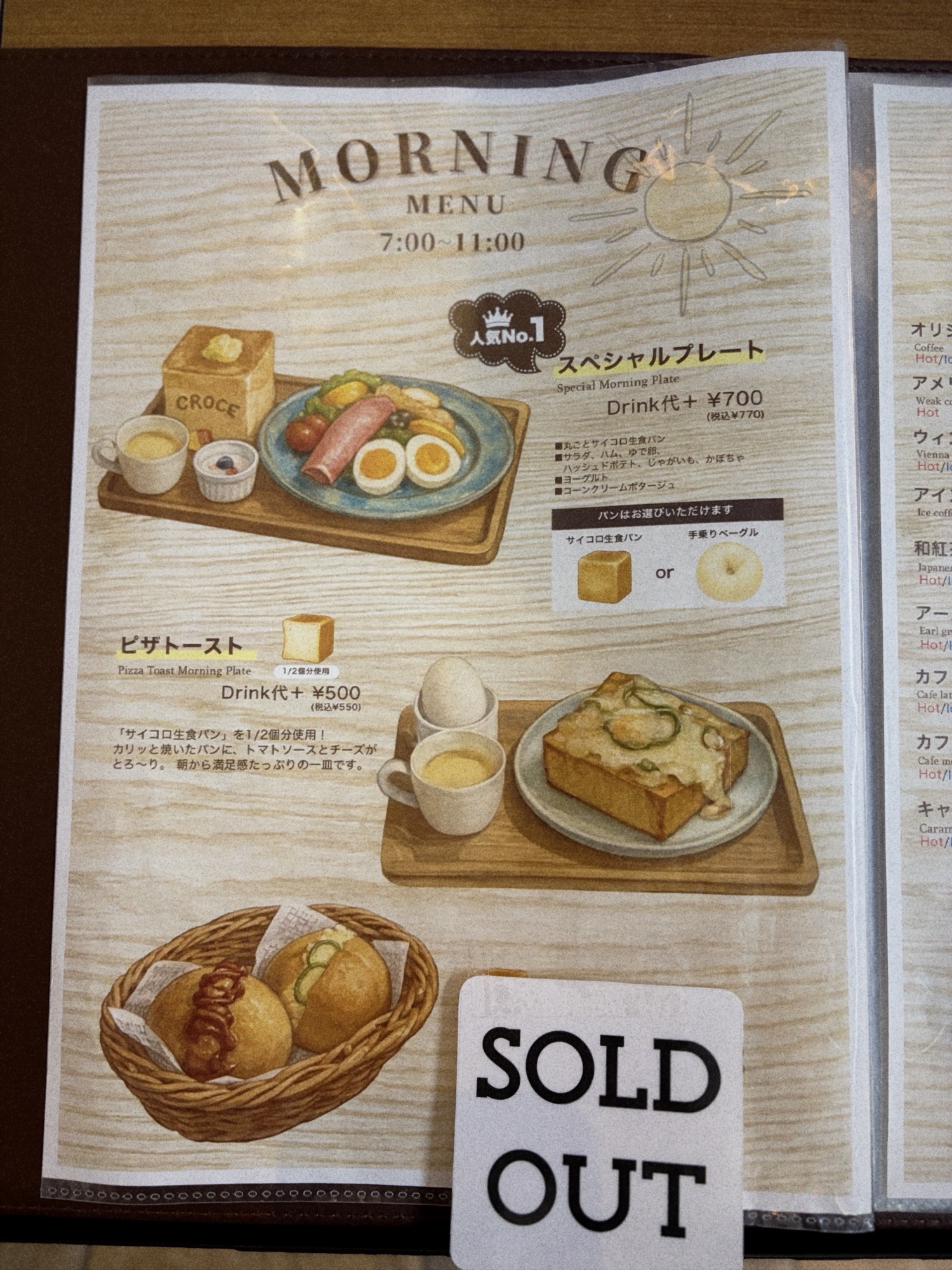 何故か、下段のピザトーストは開店直後なのに売り切れ?!まぁいいけど。